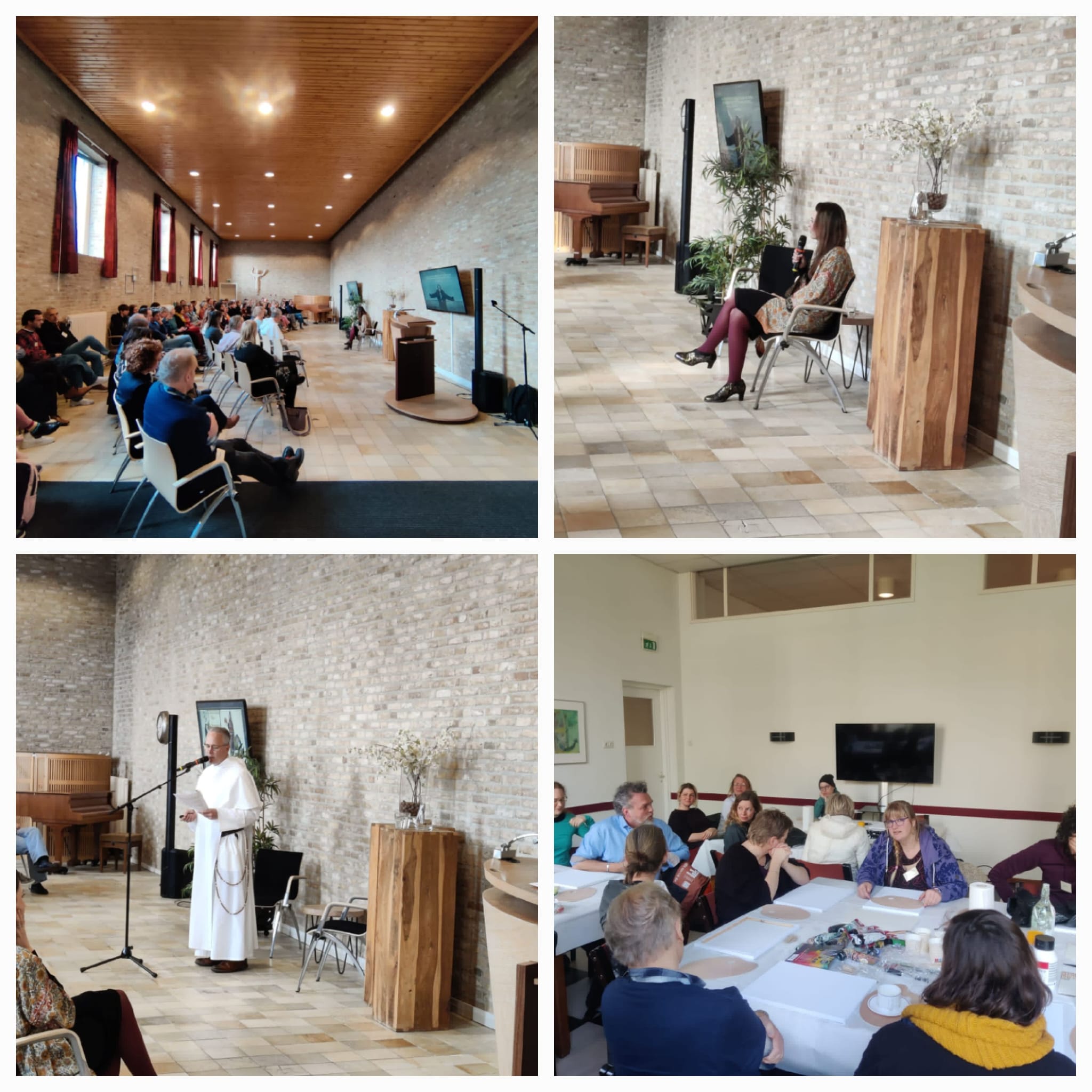 Dan volgen de workshops. Ik ga naar de schilderworkshop van Tamara Tubbing, kunstenaar en deskundige op het gebied van hoogbegaafde kinderen. Voorafgaand aan de workshop legt Tamara uit hoe ze als jonge vrouw het gevoel had dat ze zich niet écht liet zien, ook niet in haar geloof. Toen ze zich ging uiten door middel van het maken van kunst vanuit haar hart en intuïtie, veranderde dat. Via het schilderen kon ze haar authenticiteit laten zien, en daardoor ook datgene wat haar in het geloof raakte. Het schilderen gaf haar de ruimte om te spelen, te ontdekken, te experimenteren, en zich te realiseren dat kwetsbaarheid een enorme kracht in zich heeft.